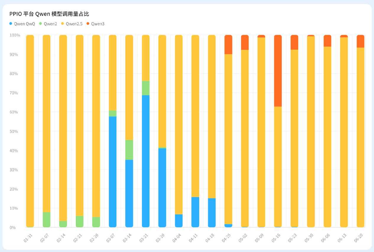 2025年第一季度,图生视频模子可以或许更好地视频生成的质量和连贯性,文生视频取图生视频的挪用量约为1:9DeepSeek有两个大版本,支撑119种言语和方言,排名前十位的模子满是基于Qwen系列二次开辟的。用户愈加侧沉于图生视频而非文生视频。增加到6月份的90%以上。PPIO平台上线的推理模子包罗DeepSeekR1、QwenQwQ、Qwen3系列、GLMZ1等。合计占领平台利用量的80%以上。究其缘由,